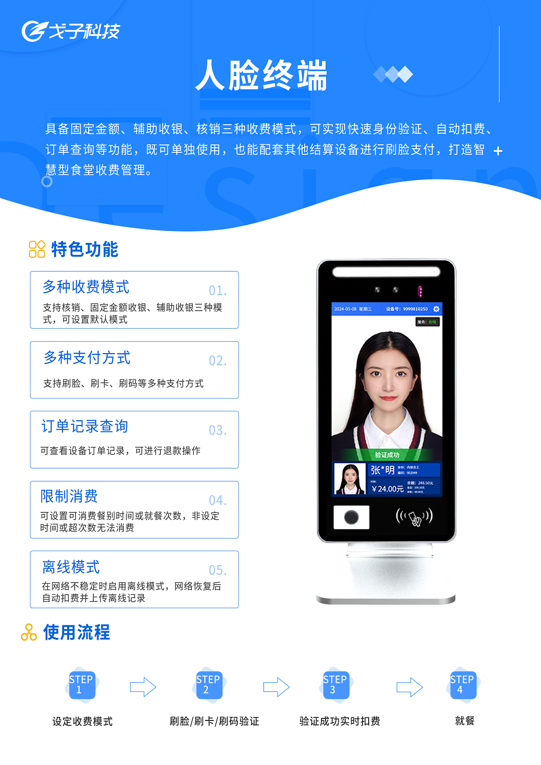 戈子科技人臉識(shí)別終端利用AI智能人臉識(shí)別技術(shù),專(zhuān)業(yè)提供精準(zhǔn)實(shí)時(shí)的人臉檢測(cè),分析,識(shí)別等功能,其用于食堂快速收銀的人臉識(shí)別就餐管理,支持刷卡,掃碼和人臉支付,測(cè)評(píng)準(zhǔn)確度高達(dá)99.80%,覆蓋多種企業(yè)場(chǎng)景,高效解決企業(yè)常見(jiàn)痛點(diǎn)。