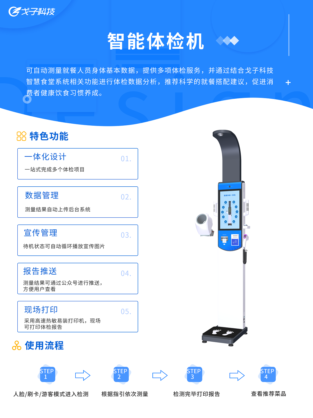 可自動(dòng)測(cè)量就餐人員身體基本數(shù)據(jù),提供多項(xiàng)體檢服務(wù),并通過結(jié)合戈子科技智慧食堂系統(tǒng)相關(guān)功能進(jìn)行體檢數(shù)據(jù)分析,推薦科學(xué)的就餐搭配建議,促進(jìn)消費(fèi)者健康飲食習(xí)慣養(yǎng)成。