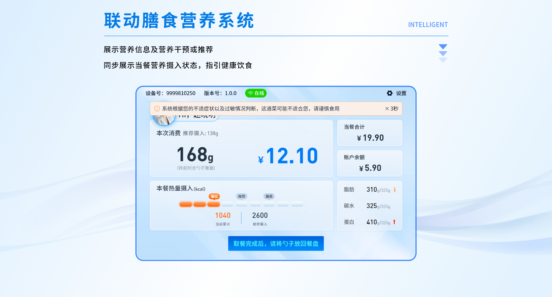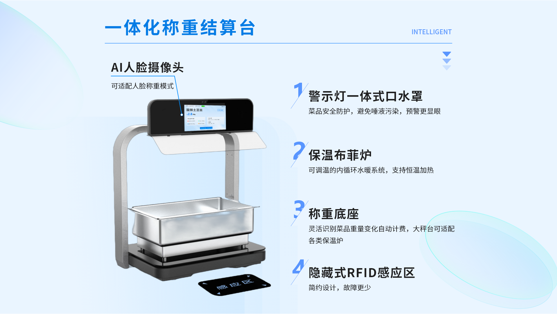智能稱重結(jié)算臺一體化設(shè)計(jì),基于餐飲云平臺為就餐者提供的無感支付、自助餐飲的智能化集成式系統(tǒng)。用戶綁定托盤后,通過托盤感應(yīng)臺讀取托盤信息,即可在多個(gè)智能秤上自助稱重取餐,取餐完成后通過空中支付進(jìn)行就餐結(jié)算。