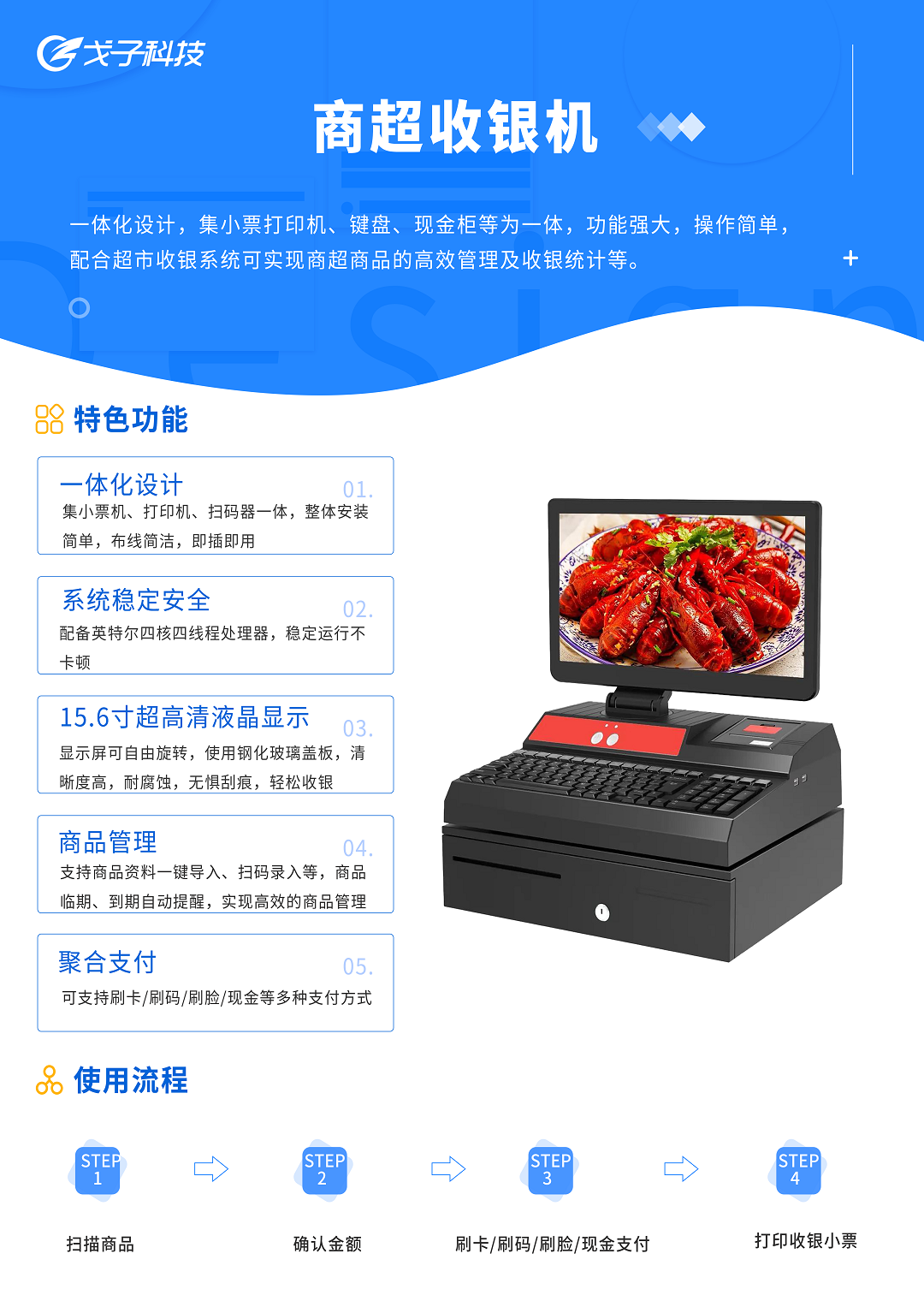 戈子科技商超收銀機(jī)是一款一體化設(shè)計(jì)收銀機(jī),集小票打印機(jī)、鍵盤、現(xiàn)金柜等為一體,功能強(qiáng)大,操作簡單,配合超市收銀系統(tǒng)可實(shí)現(xiàn)商超商品的高效管理及收銀統(tǒng)計(jì)等功能,實(shí)現(xiàn)智能商超管理。