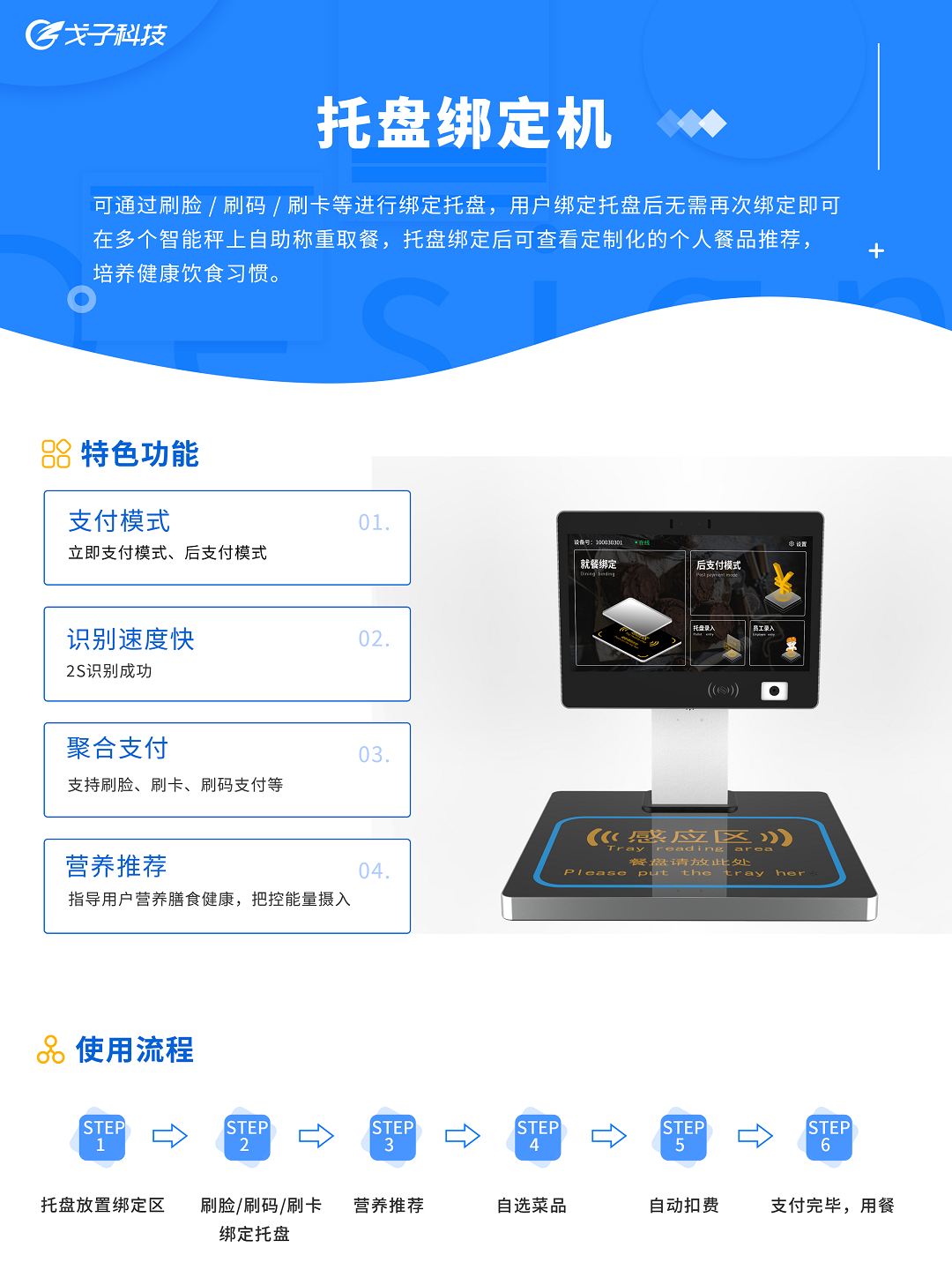 戈子科技智慧食堂托盤綁定機-餐廳內(nèi)部一卡通用戶可在人臉托盤綁定機上注冊人臉綁定托盤,人臉已注冊的用戶可直接在托盤綁定機上通過人臉進行綁定托盤,用戶也可在托盤綁定機上直接刷卡綁定托盤,用戶綁定托盤后無需再次綁定即可在多個智能秤上自助稱重取餐,取餐完成后通過空中支付進行就餐結(jié)算,以實現(xiàn)在餐廳稱重取餐并無感支付的飲食體驗。